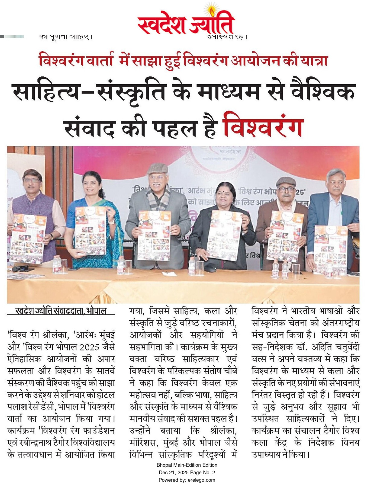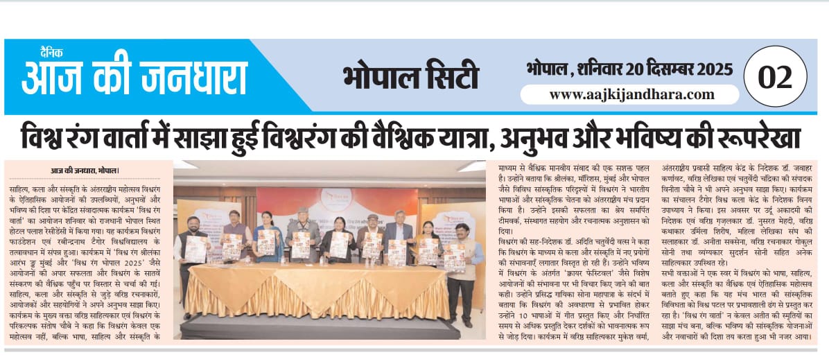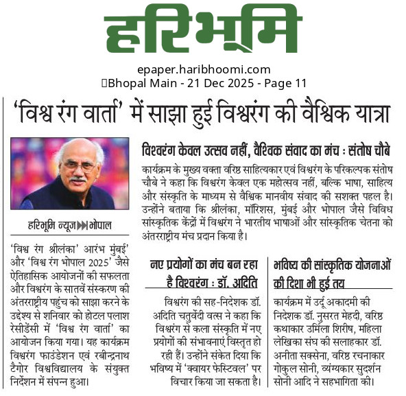कार्यक्रम में प्रमुख न्यूज़ चैनलों ने हिस्सा लिया और विश्वरंग के आगामी सेशंस व गतिविधियों पर विशेष चर्चा हुई। इस अवसर पर श्री संतोष चौबे (विश्वरंग निदेशक), डॉ. जवाहर कर्णावत, डॉ. पूजा शुक्ला, डॉ. सिद्धार्थ चतुर्वेदी, डॉ. अदिति चतुर्वेदी और श्री विनय उपाध्याय उपस्थित रहे।