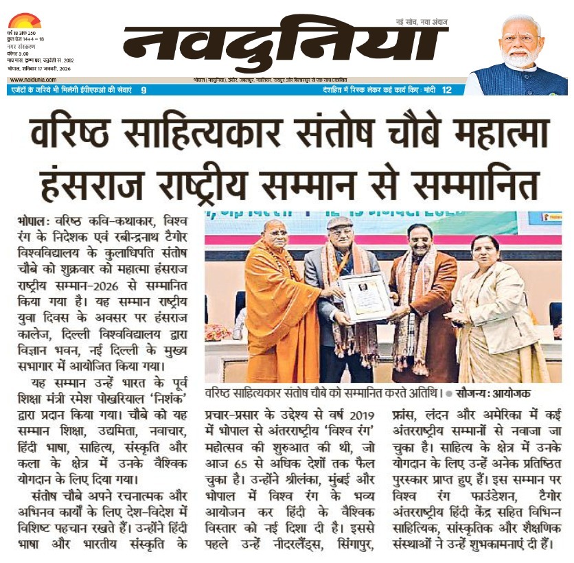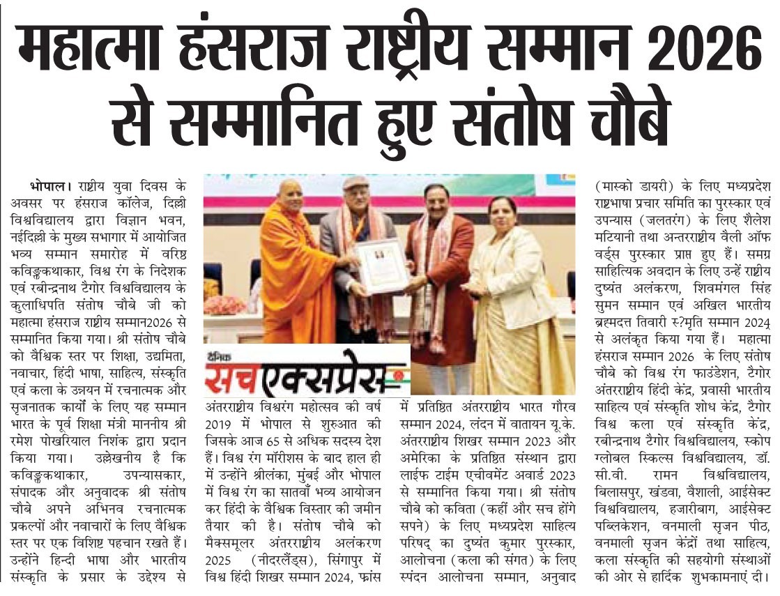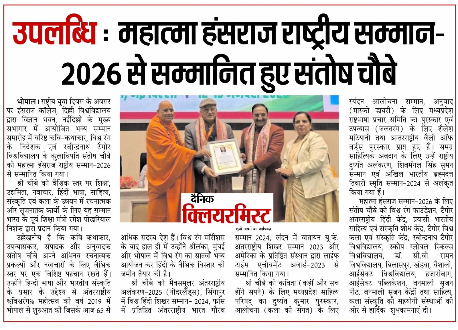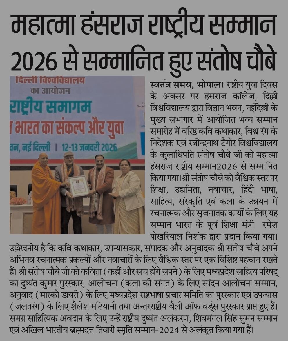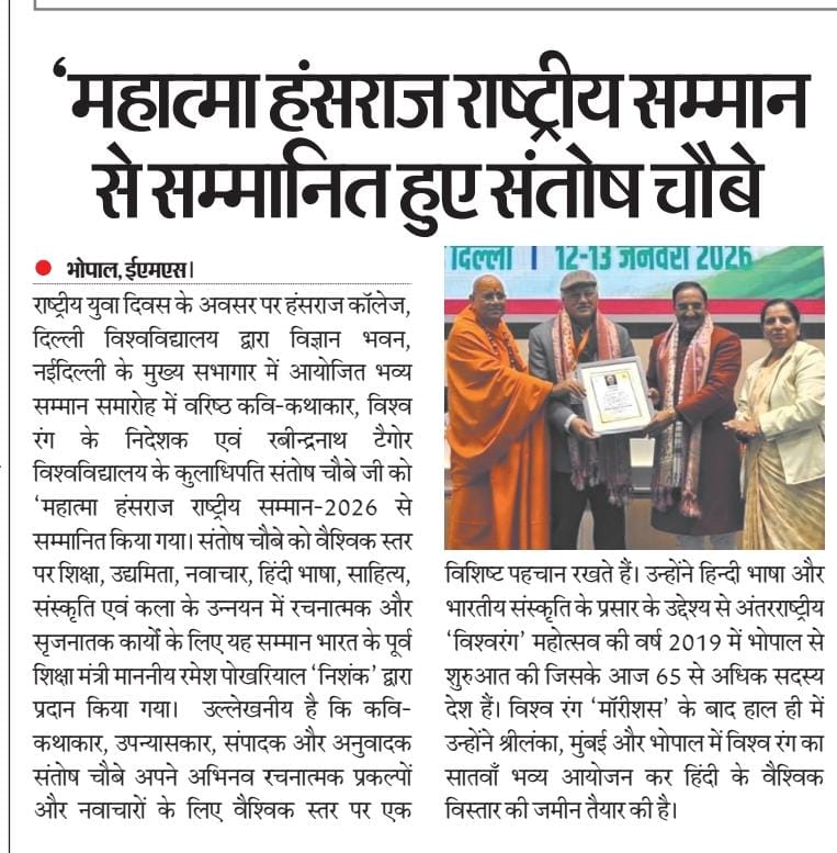 राष्ट्रीय युवा दिवस के अवसर पर हंसराज कॉलेज, दिल्ली विश्वविद्यालय द्वारा विज्ञान भवन, नईदिल्ली के मुख्य सभागार में आयोजित भव्य सम्मान समारोह में वरिष्ठ कवि–कथाकार, विश्व रंग के निदेशक एवं रबीन्द्रनाथ टैगोर विश्वविद्यालय के कुलाधिपति संतोष चौबे जी को "महात्मा हंसराज राष्ट्रीय सम्मान–2026 से सम्मानित किया गया।