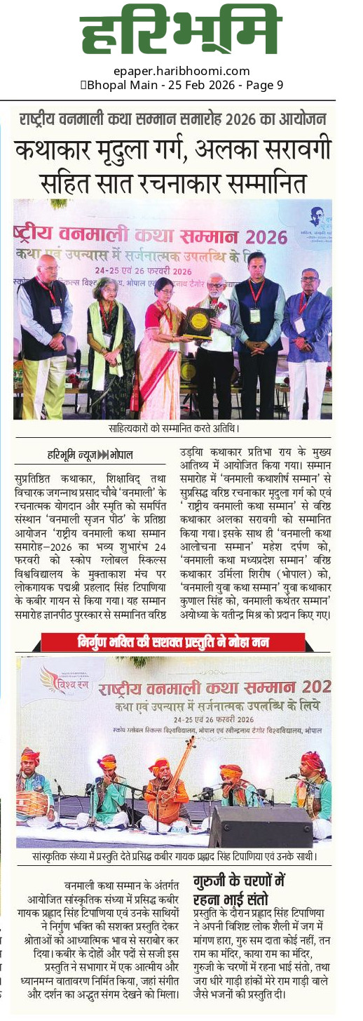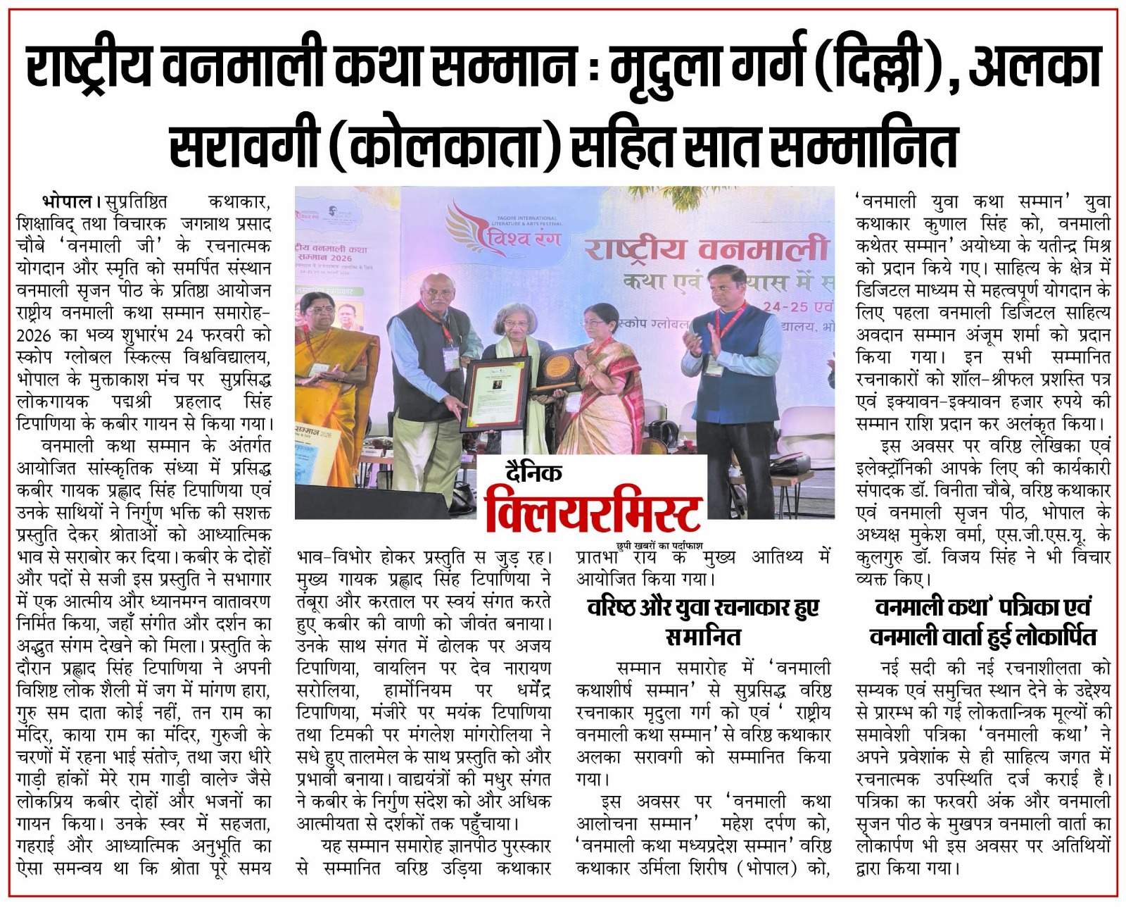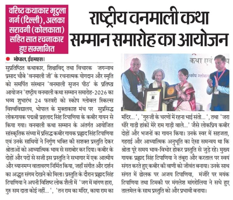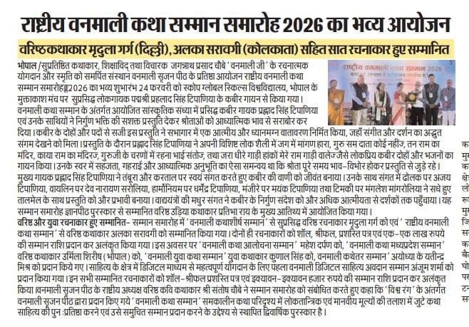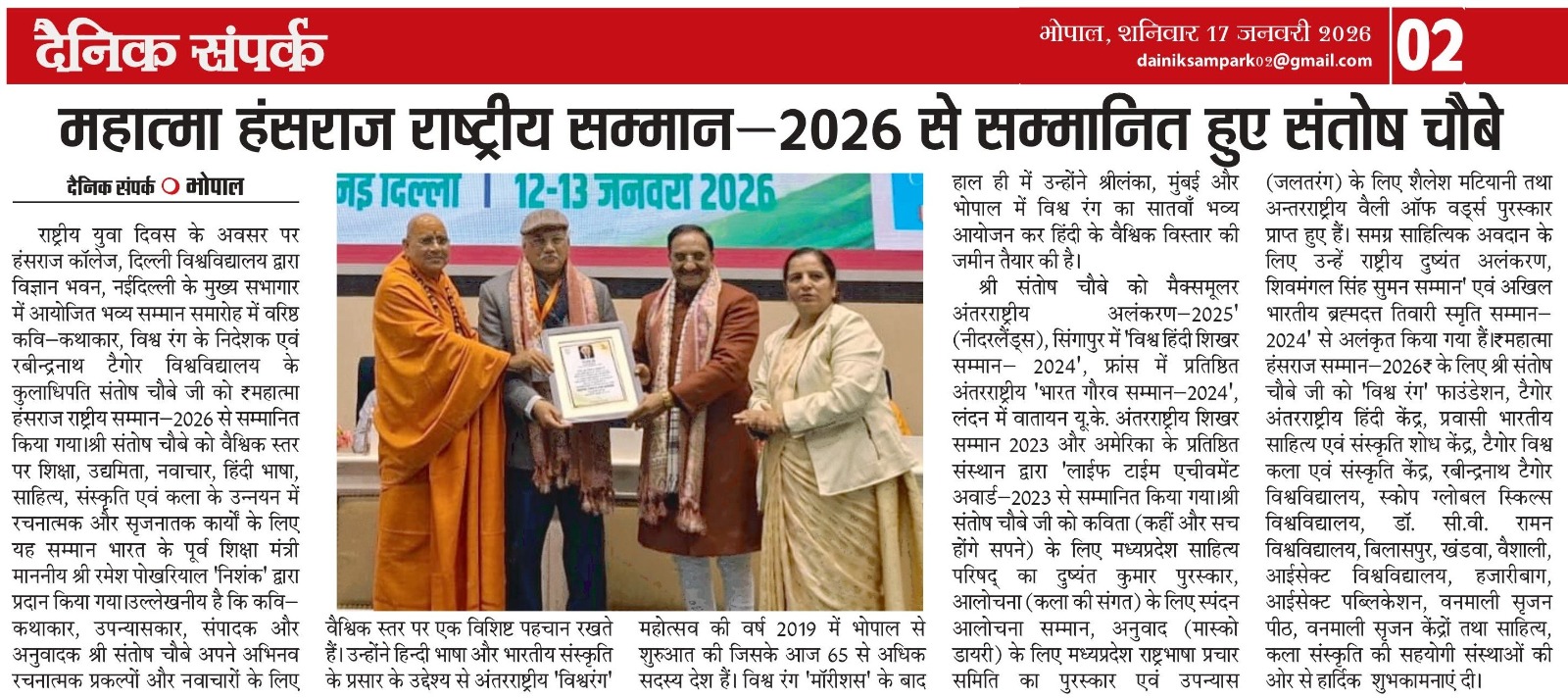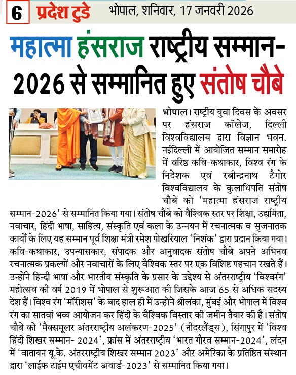 राष्ट्रीय युवा दिवस के अवसर पर हंसराज कॉलेज, दिल्ली विश्वविद्यालय द्वारा विज्ञान भवन, नईदिल्ली के मुख्य सभागार में आयोजित भव्य सम्मान समारोह में वरिष्ठ कवि–कथाकार, विश्व रंग के निदेशक एवं रबीन्द्रनाथ टैगोर विश्वविद्यालय के कुलाधिपति संतोष चौबे जी को "महात्मा हंसराज राष्ट्रीय सम्मान–2026 से सम्मानित किया गया।