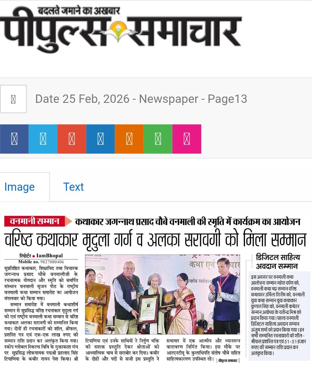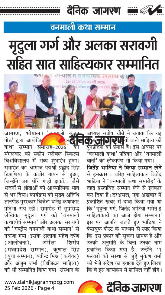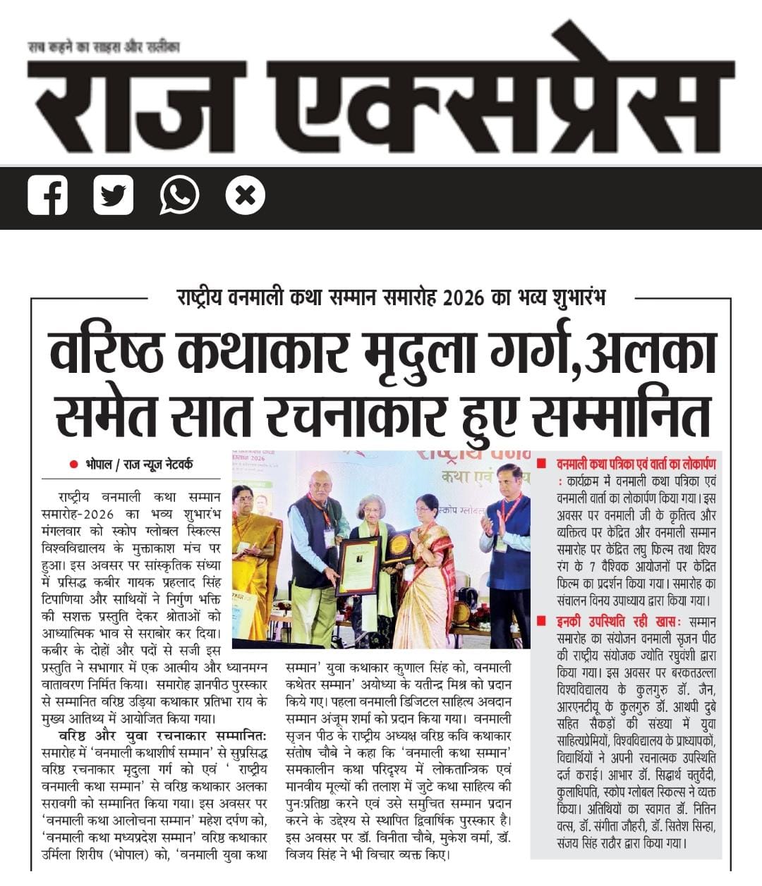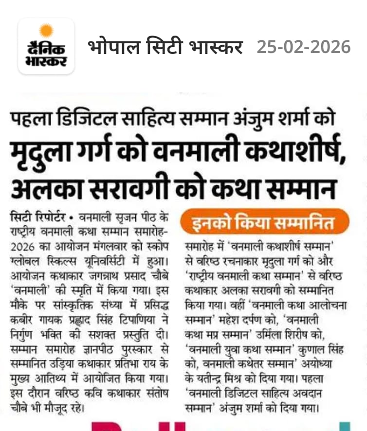 राजस्थान के नीमराना में आयोजित दो दिवसीय राठ रंग महोत्सव में शामिल होना गर्व का क्षण रहा। इस अवसर पर साझा संसार फाउंडेशन (नीदरलैंड) और राठ की धरा–जाट बहरोड़ द्वारा “प्रथम अंतरराष्ट्रीय मैक्समूलर अलंकरण–2025” से सम्मानित किया गया। यह सम्मान हिंदी भाषा, साहित्य, संस्कृति और कला के वैश्विक प्रचार-प्रसार एवं उन्नयन के लिए किए गए कार्यों की सराहना स्वरूप प्रदान किया गया। इस सम्मान ने समाज और संस्कृति के प्रति और अधिक समर्पण के साथ कार्य करने की प्रेरणा दी है।