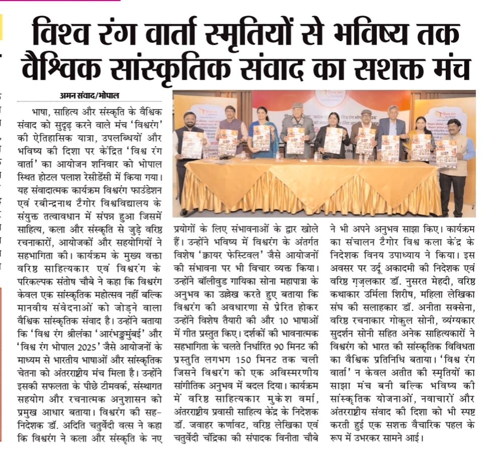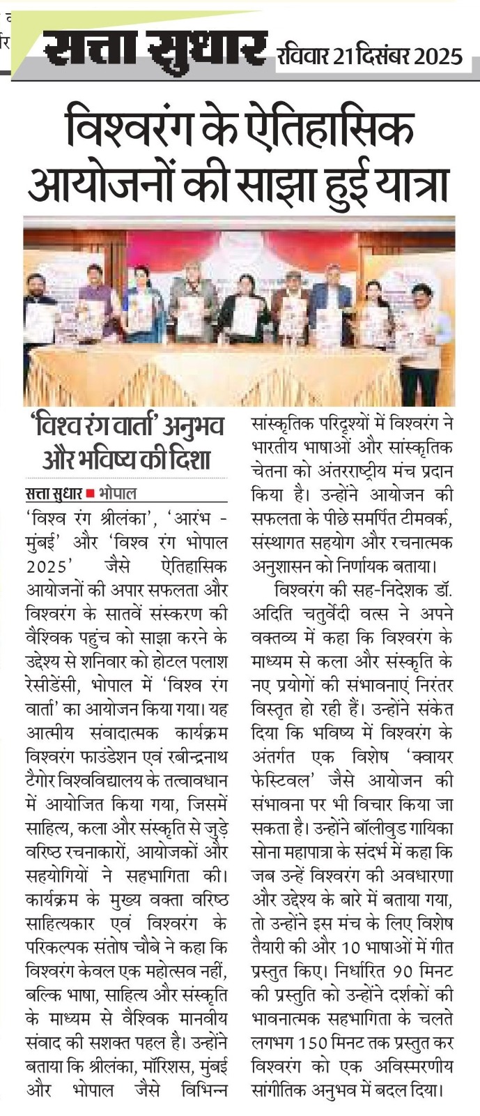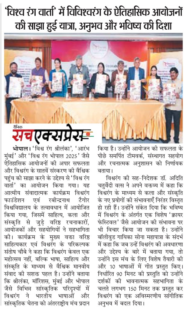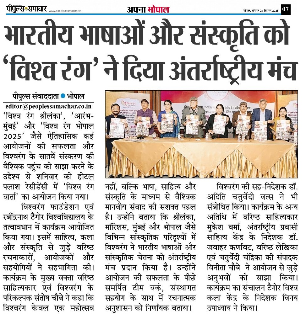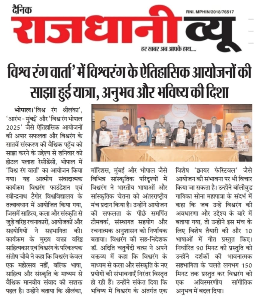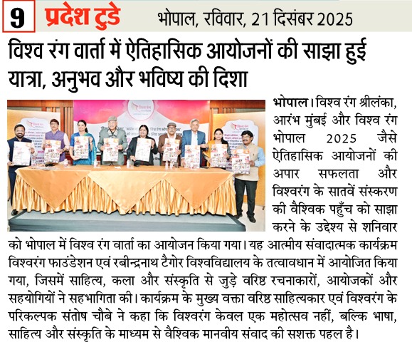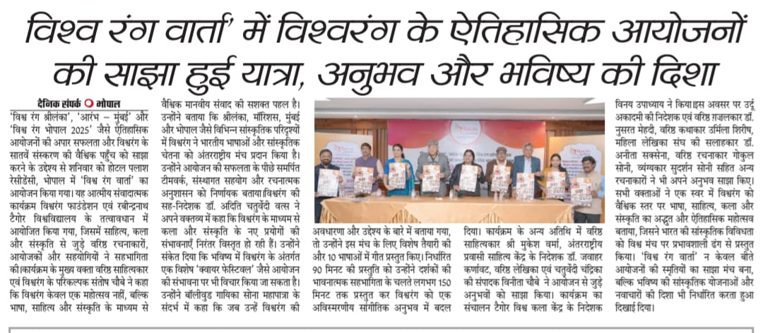 कार्यक्रम में प्रमुख न्यूज़ चैनलों ने हिस्सा लिया और विश्वरंग के आगामी सेशंस व गतिविधियों पर विशेष चर्चा हुई। इस अवसर पर श्री संतोष चौबे (विश्वरंग निदेशक), डॉ. जवाहर कर्णावत, डॉ. पूजा शुक्ला, डॉ. सिद्धार्थ चतुर्वेदी, डॉ. अदिति चतुर्वेदी और श्री विनय उपाध्याय उपस्थित रहे।
