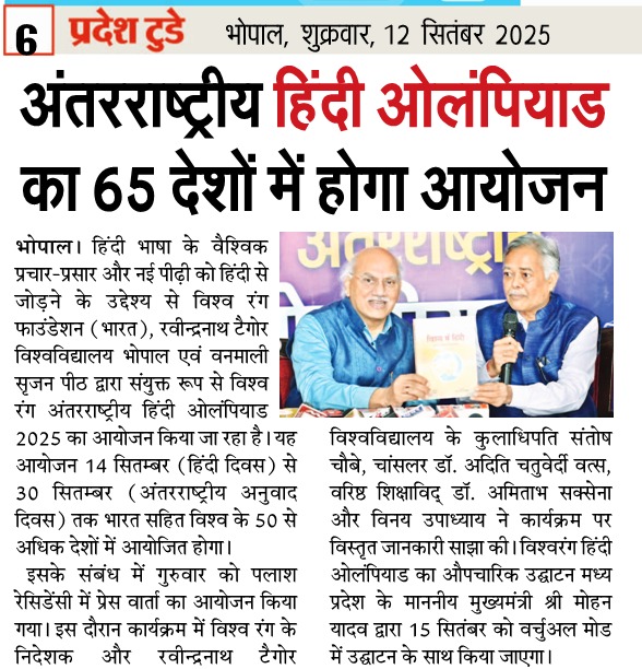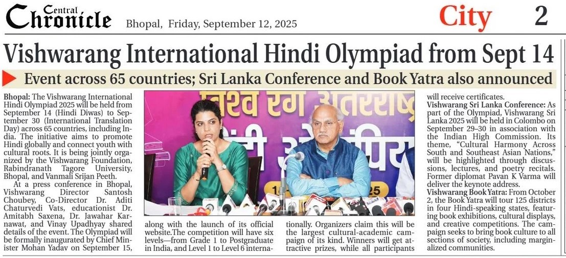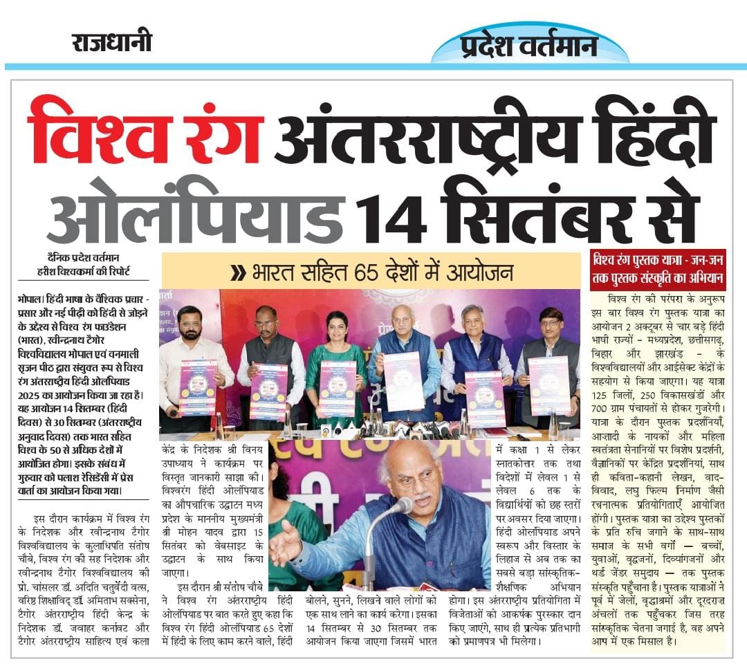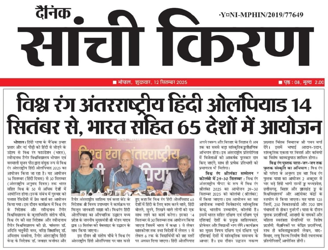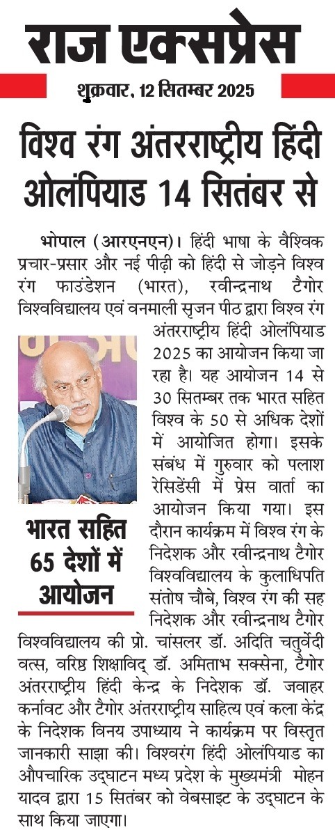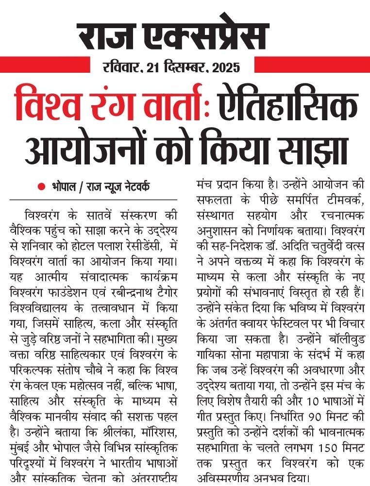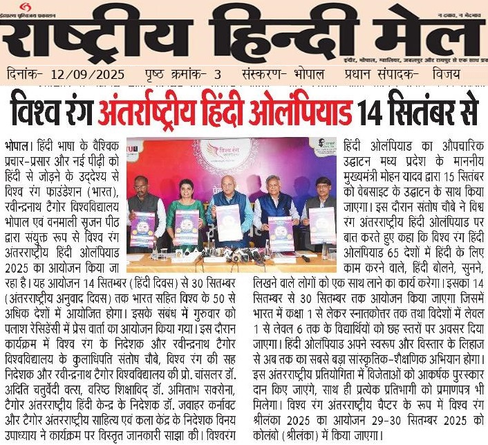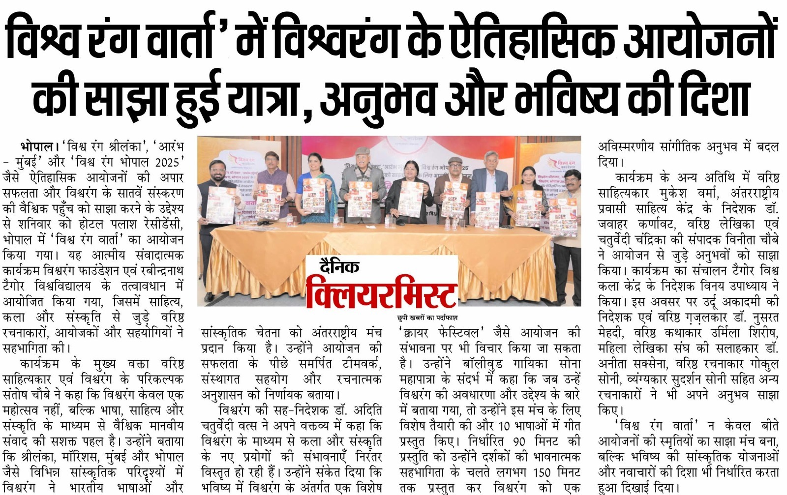 कार्यक्रम में प्रमुख न्यूज़ चैनलों ने हिस्सा लिया और विश्वरंग के आगामी सेशंस व गतिविधियों पर विशेष चर्चा हुई। इस अवसर पर श्री संतोष चौबे (विश्वरंग निदेशक), डॉ. जवाहर कर्णावत, डॉ. पूजा शुक्ला, डॉ. सिद्धार्थ चतुर्वेदी, डॉ. अदिति चतुर्वेदी और श्री विनय उपाध्याय उपस्थित रहे।