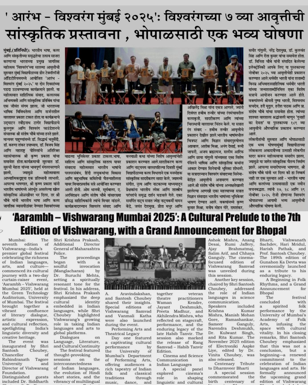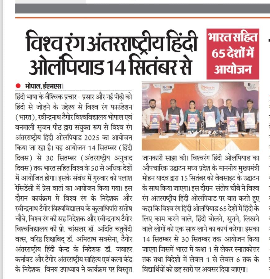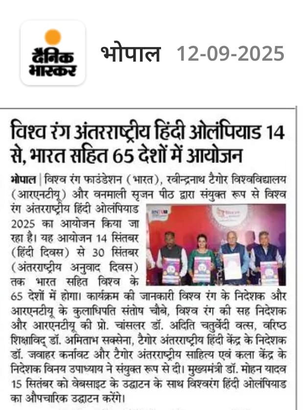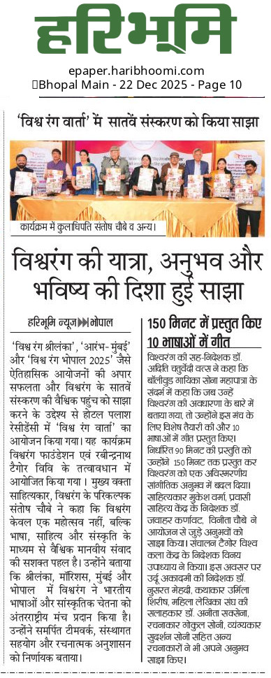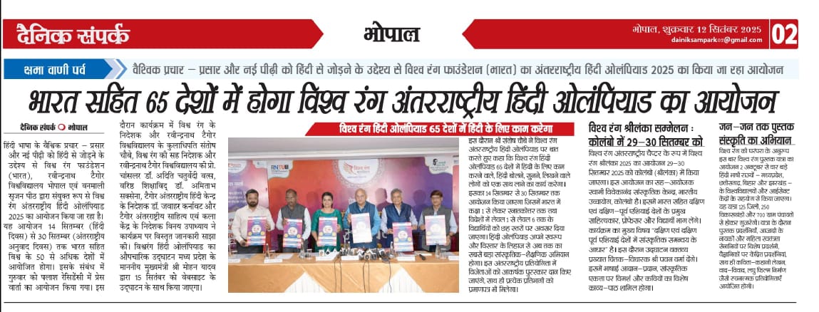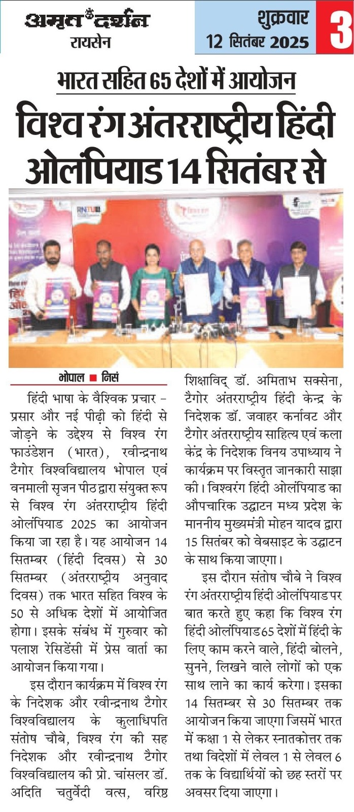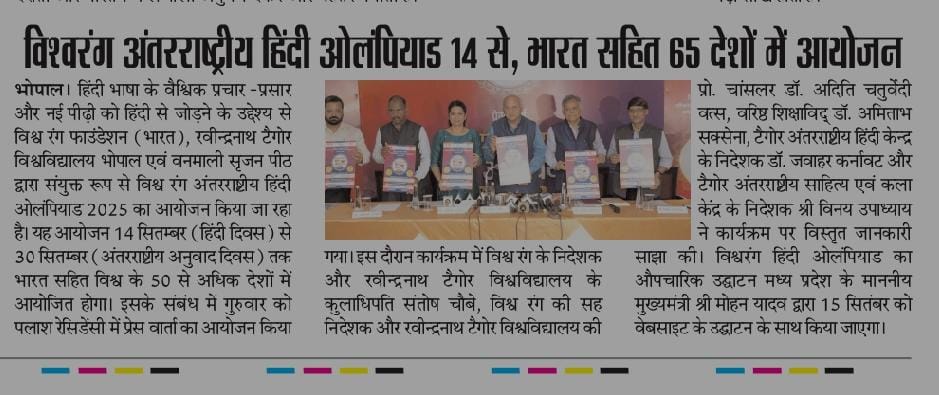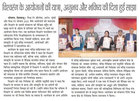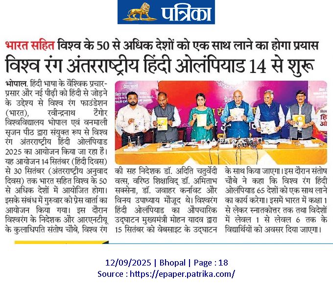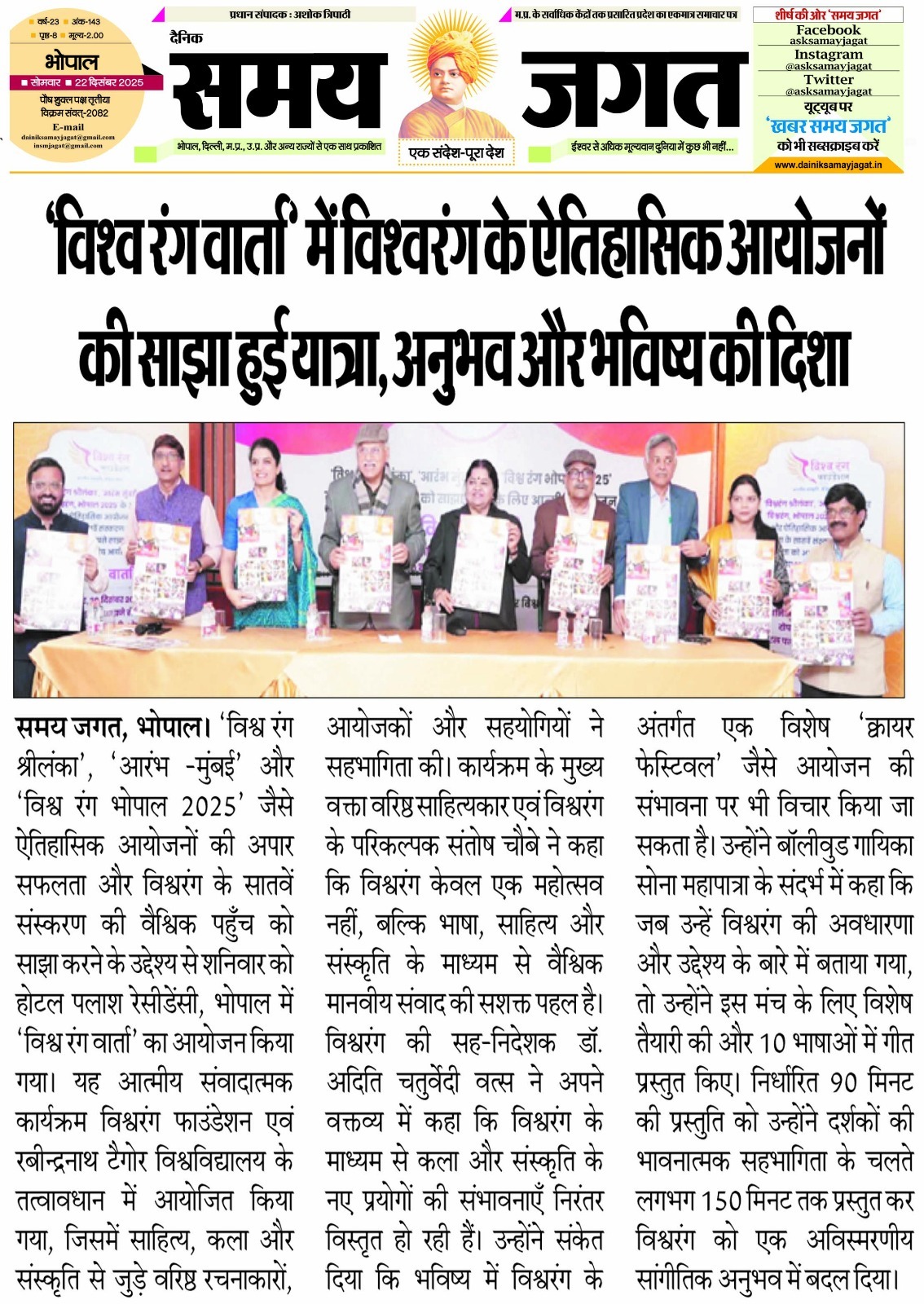 कार्यक्रम में प्रमुख न्यूज़ चैनलों ने हिस्सा लिया और विश्वरंग के आगामी सेशंस व गतिविधियों पर विशेष चर्चा हुई। इस अवसर पर श्री संतोष चौबे (विश्वरंग निदेशक), डॉ. जवाहर कर्णावत, डॉ. पूजा शुक्ला, डॉ. सिद्धार्थ चतुर्वेदी, डॉ. अदिति चतुर्वेदी और श्री विनय उपाध्याय उपस्थित रहे।