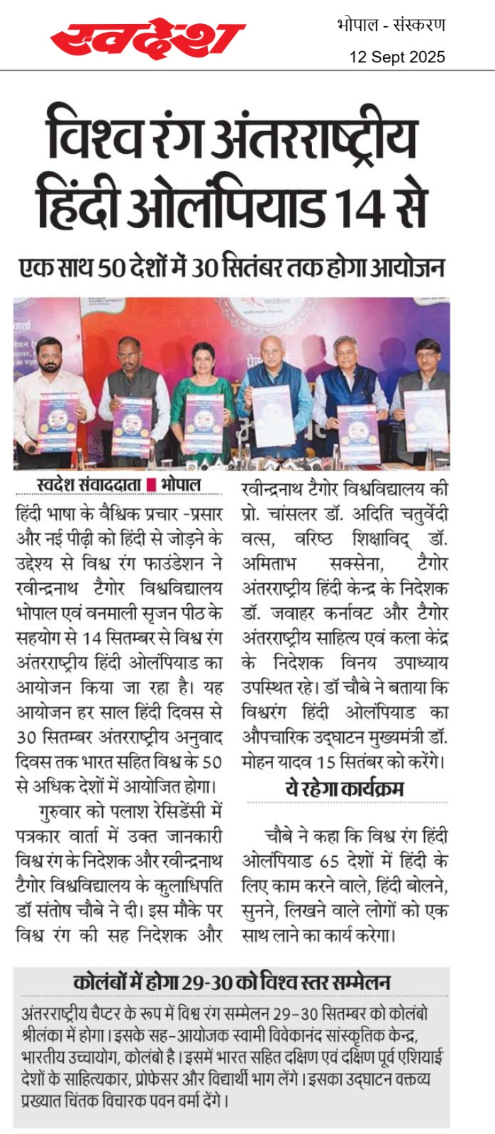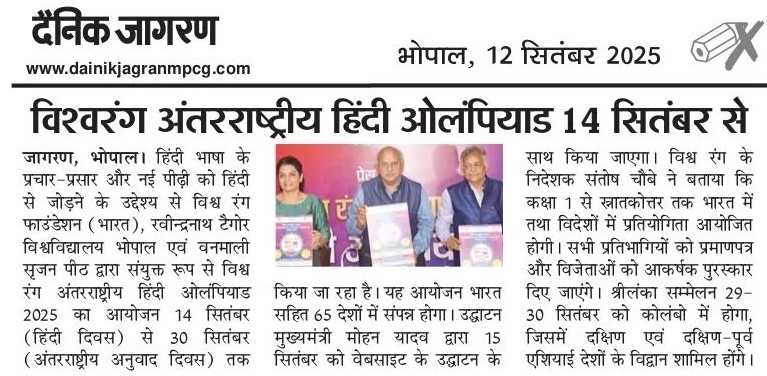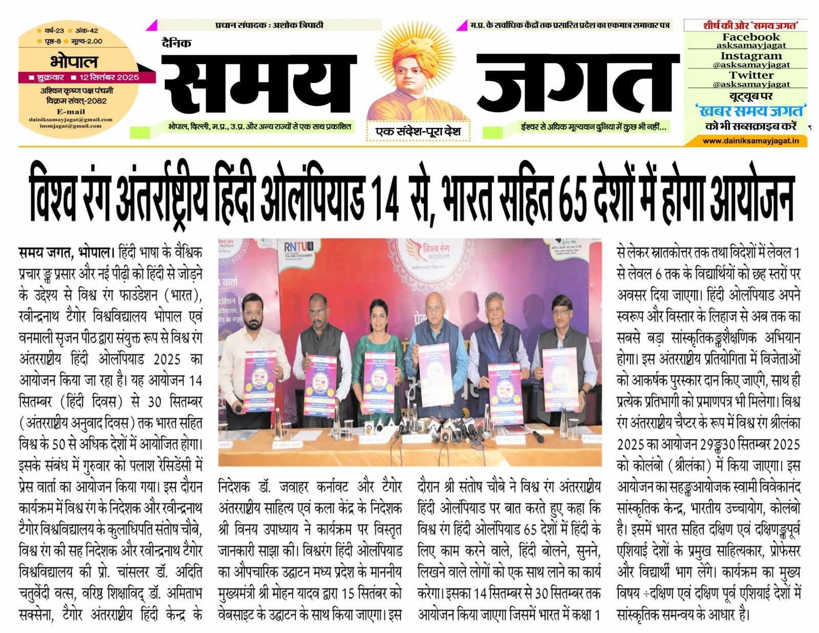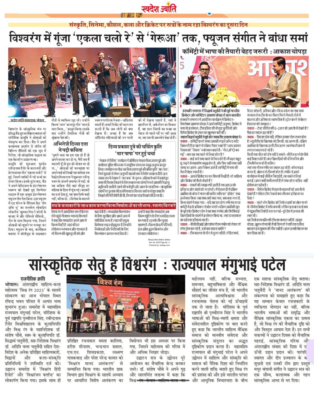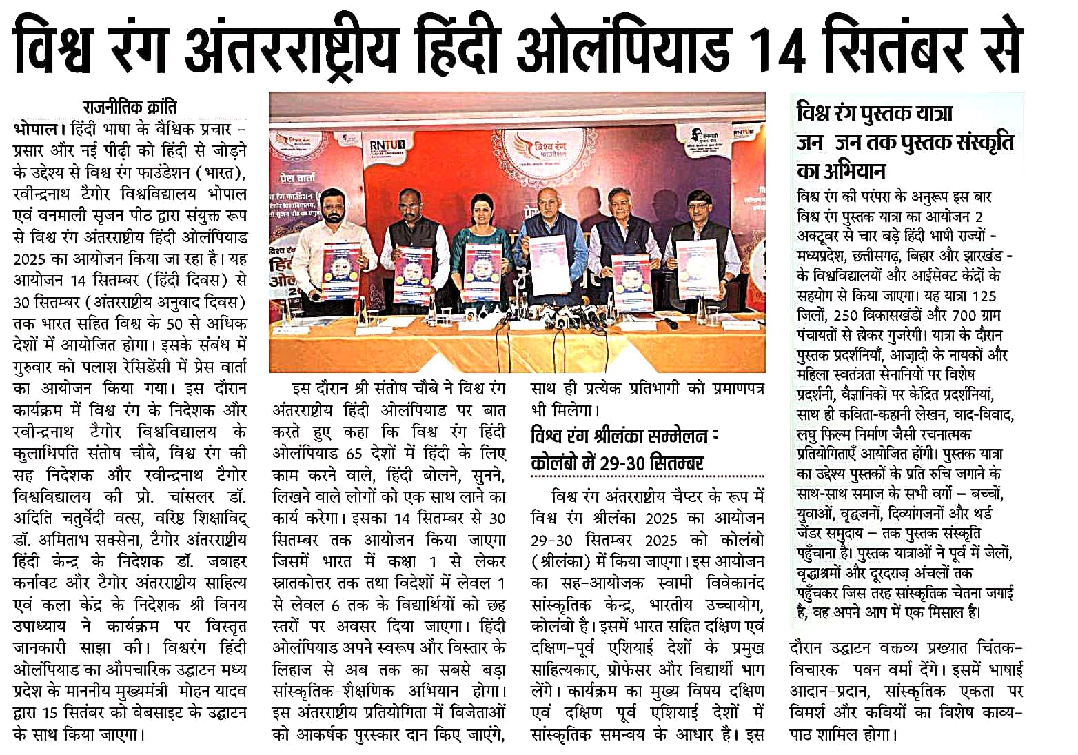 कार्यक्रम में प्रमुख न्यूज़ चैनलों ने हिस्सा लिया और विश्वरंग के आगामी सेशंस व गतिविधियों पर विशेष चर्चा हुई। इस अवसर पर श्री संतोष चौबे (विश्वरंग निदेशक), डॉ. जवाहर कर्णावत, डॉ. पूजा शुक्ला, डॉ. सिद्धार्थ चतुर्वेदी, डॉ. अदिति चतुर्वेदी और श्री विनय उपाध्याय उपस्थित रहे।