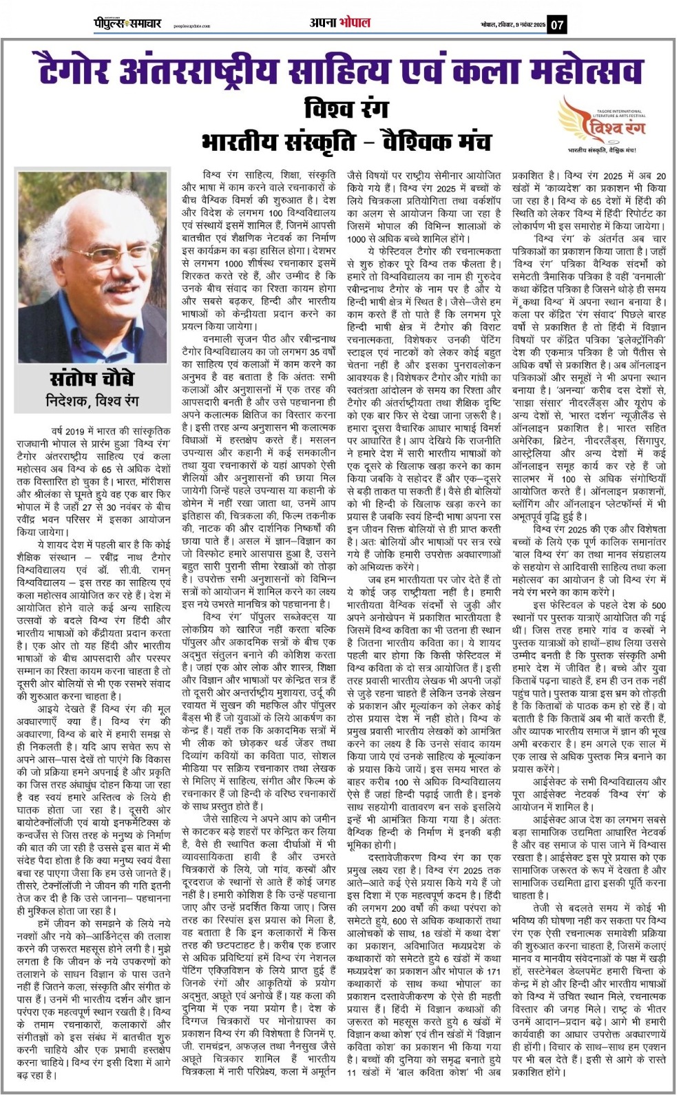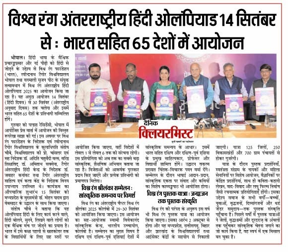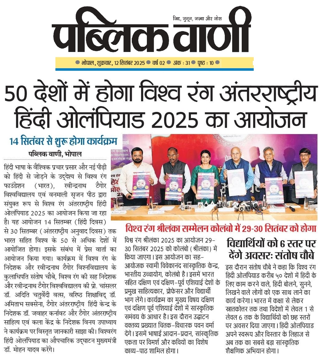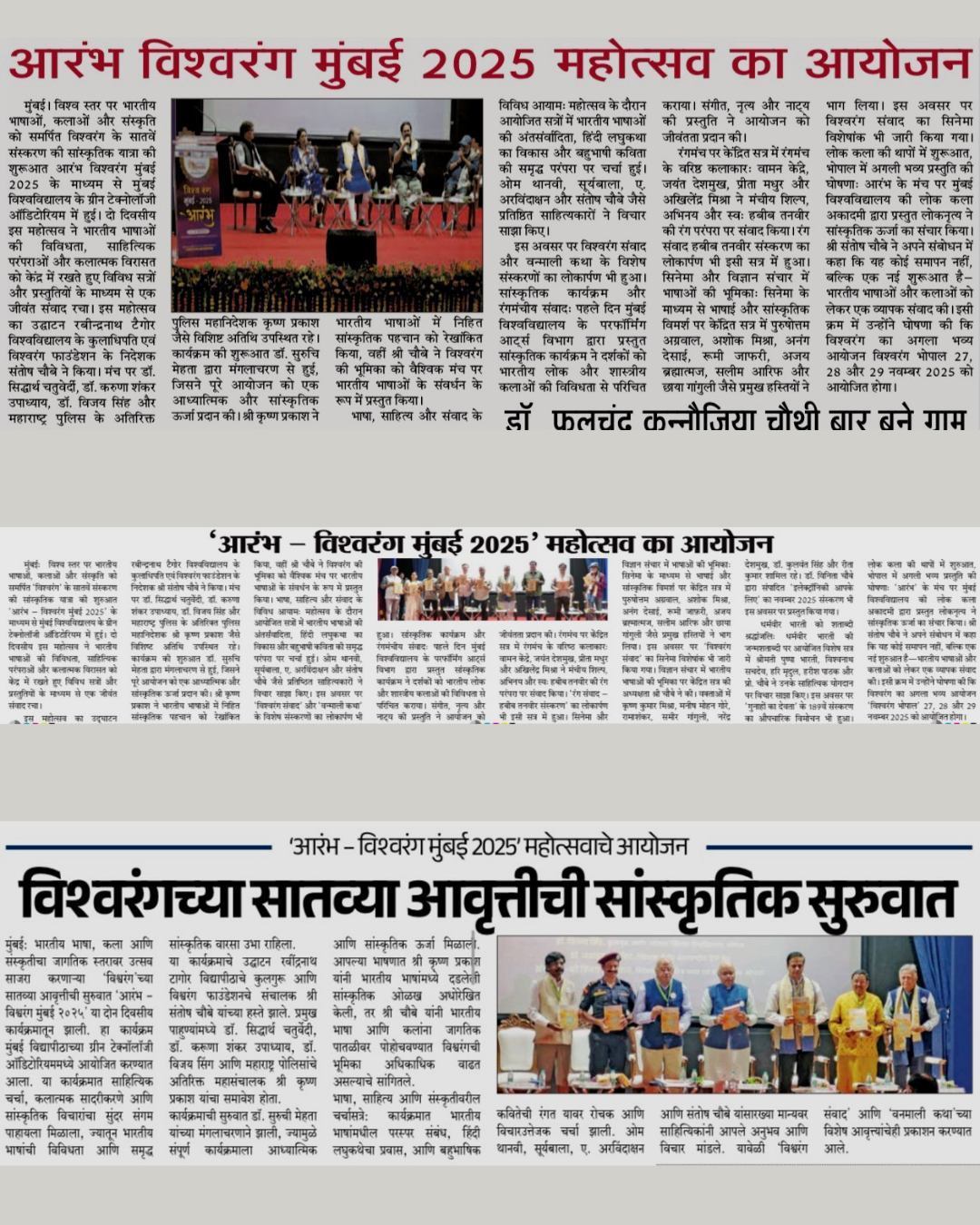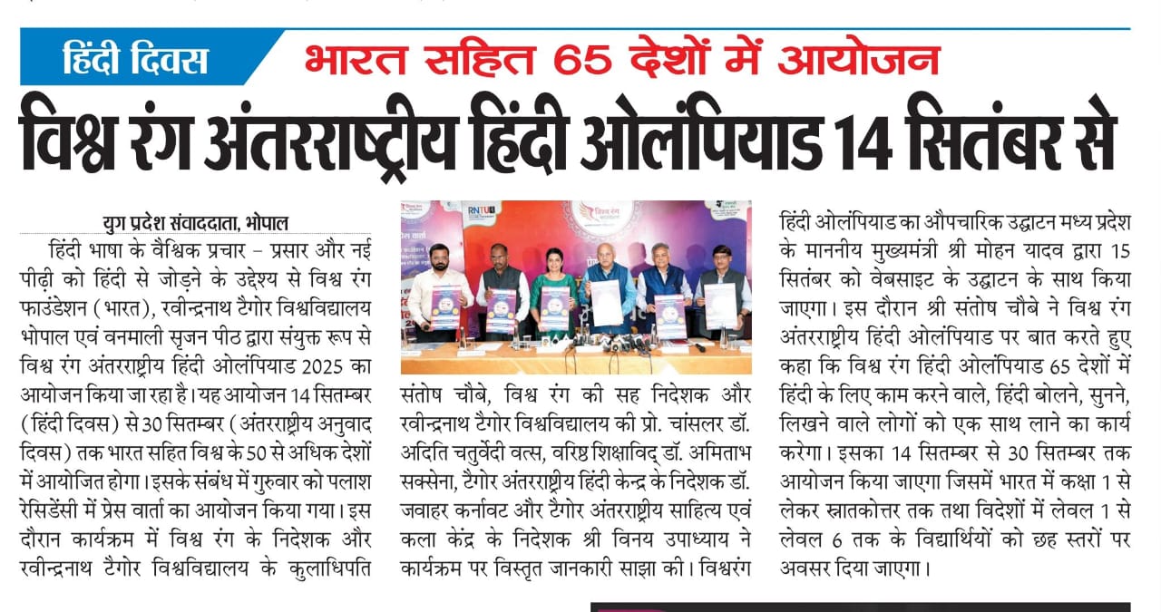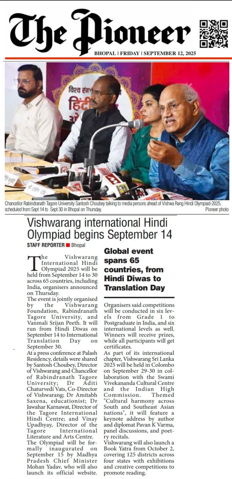कार्यक्रम में प्रमुख न्यूज़ चैनलों ने हिस्सा लिया और विश्वरंग के आगामी सेशंस व गतिविधियों पर विशेष चर्चा हुई। इस अवसर पर श्री संतोष चौबे (विश्वरंग निदेशक), डॉ. जवाहर कर्णावत, डॉ. पूजा शुक्ला, डॉ. सिद्धार्थ चतुर्वेदी, डॉ. अदिति चतुर्वेदी और श्री विनय उपाध्याय उपस्थित रहे।