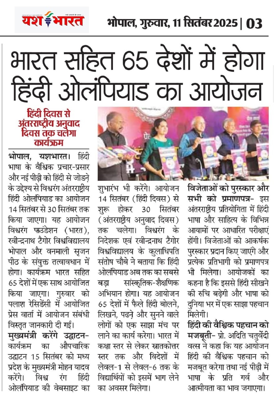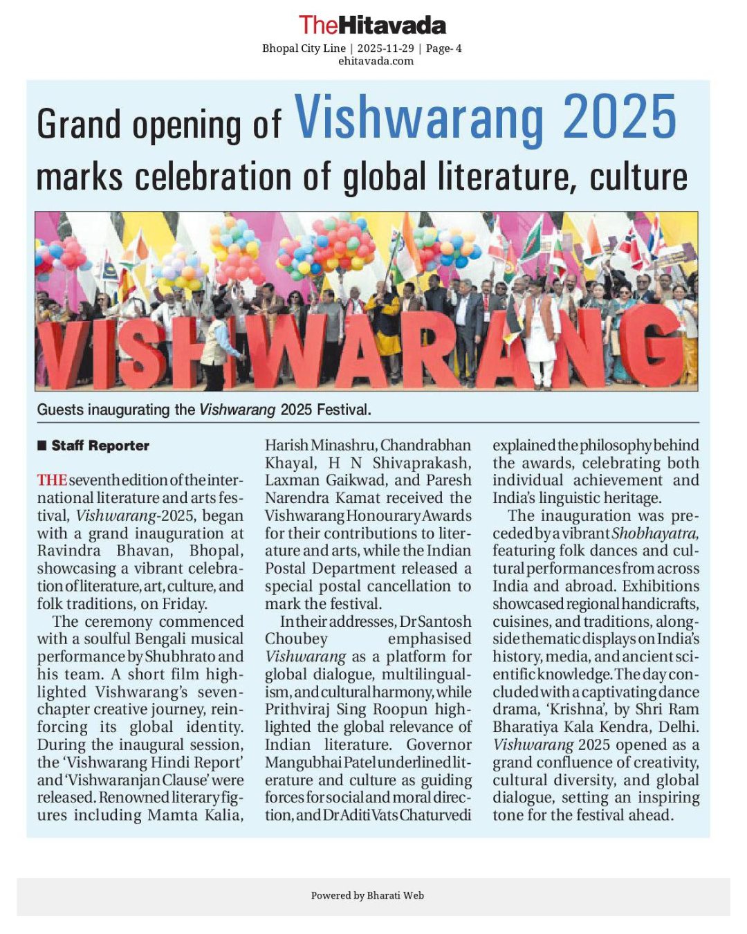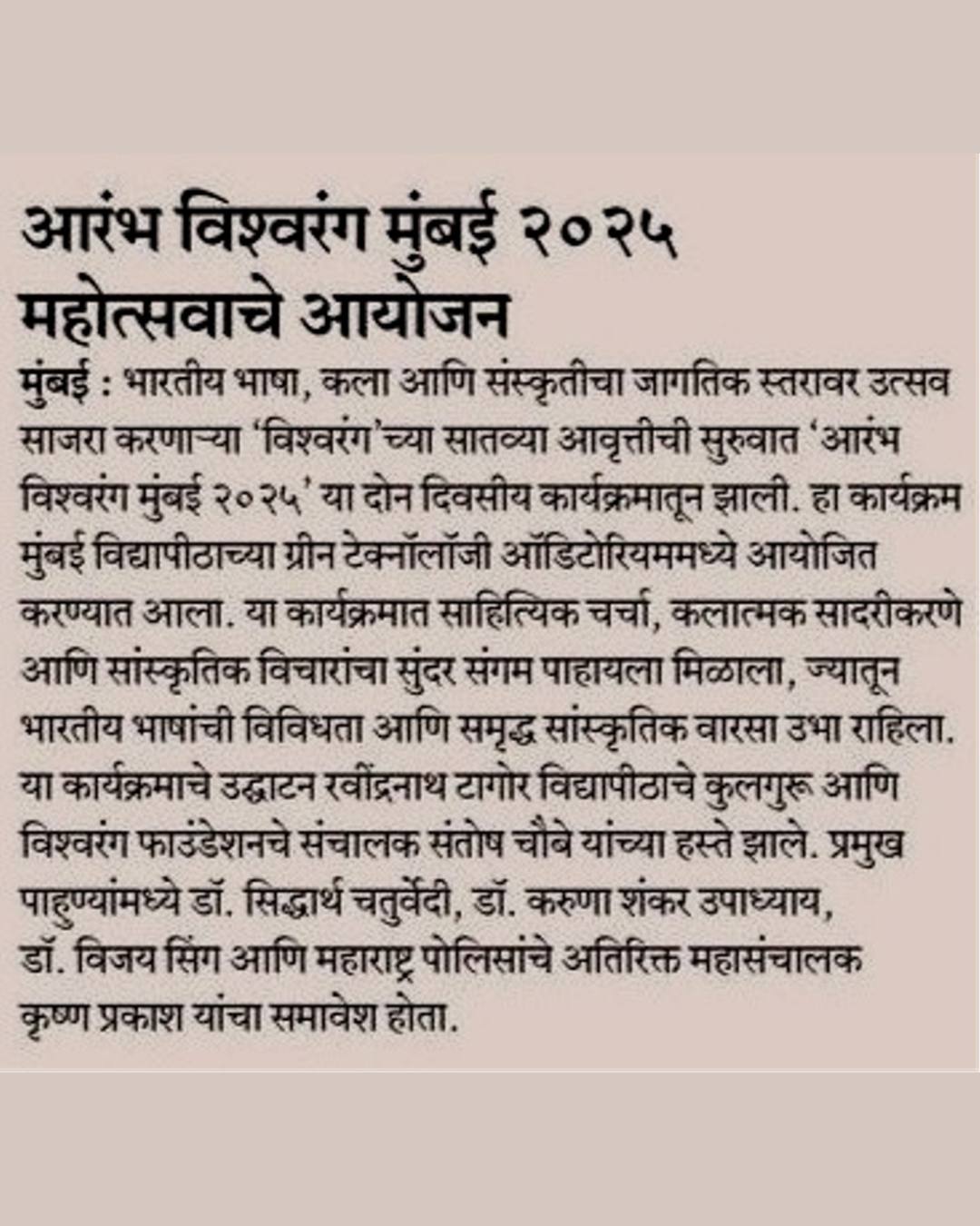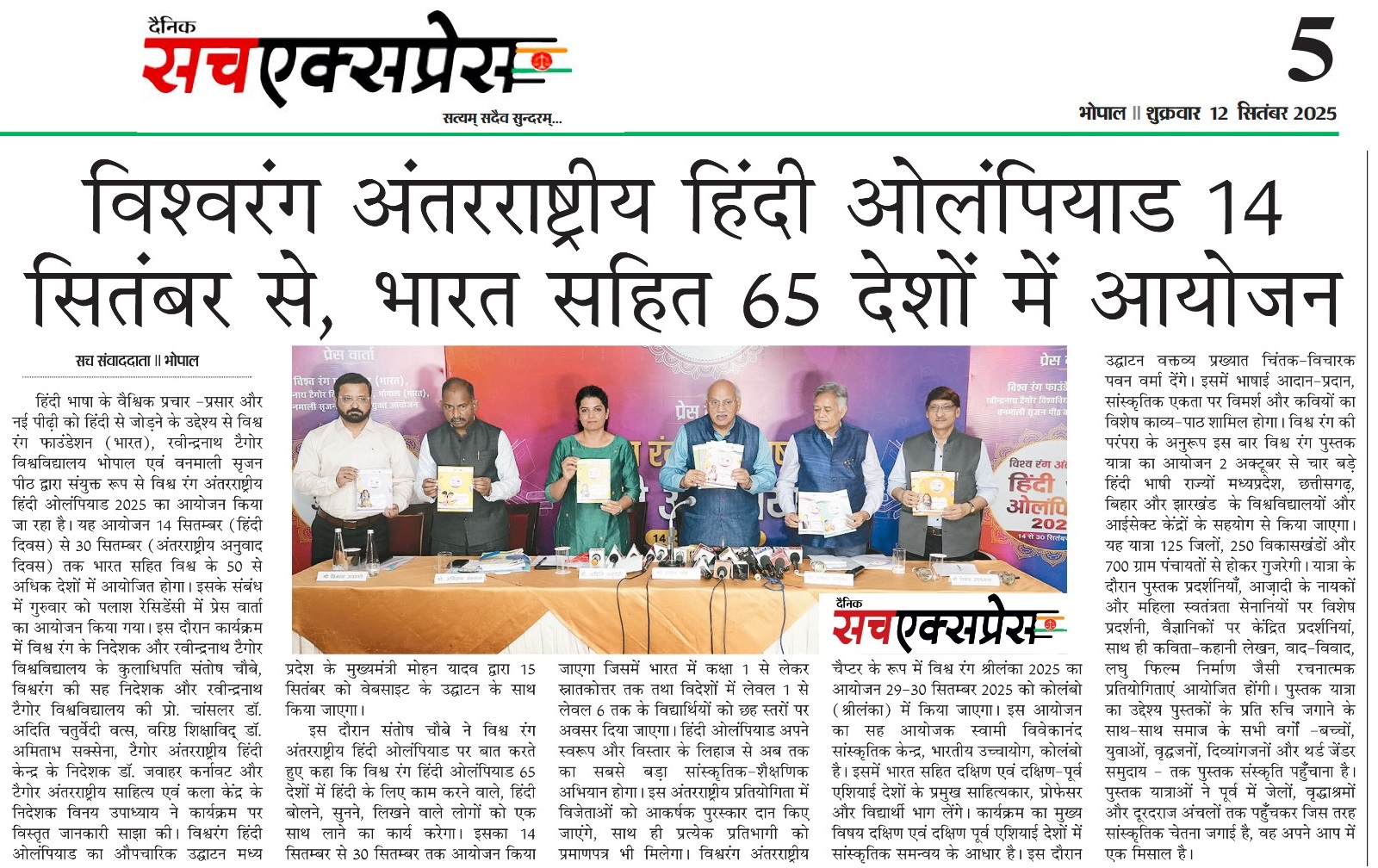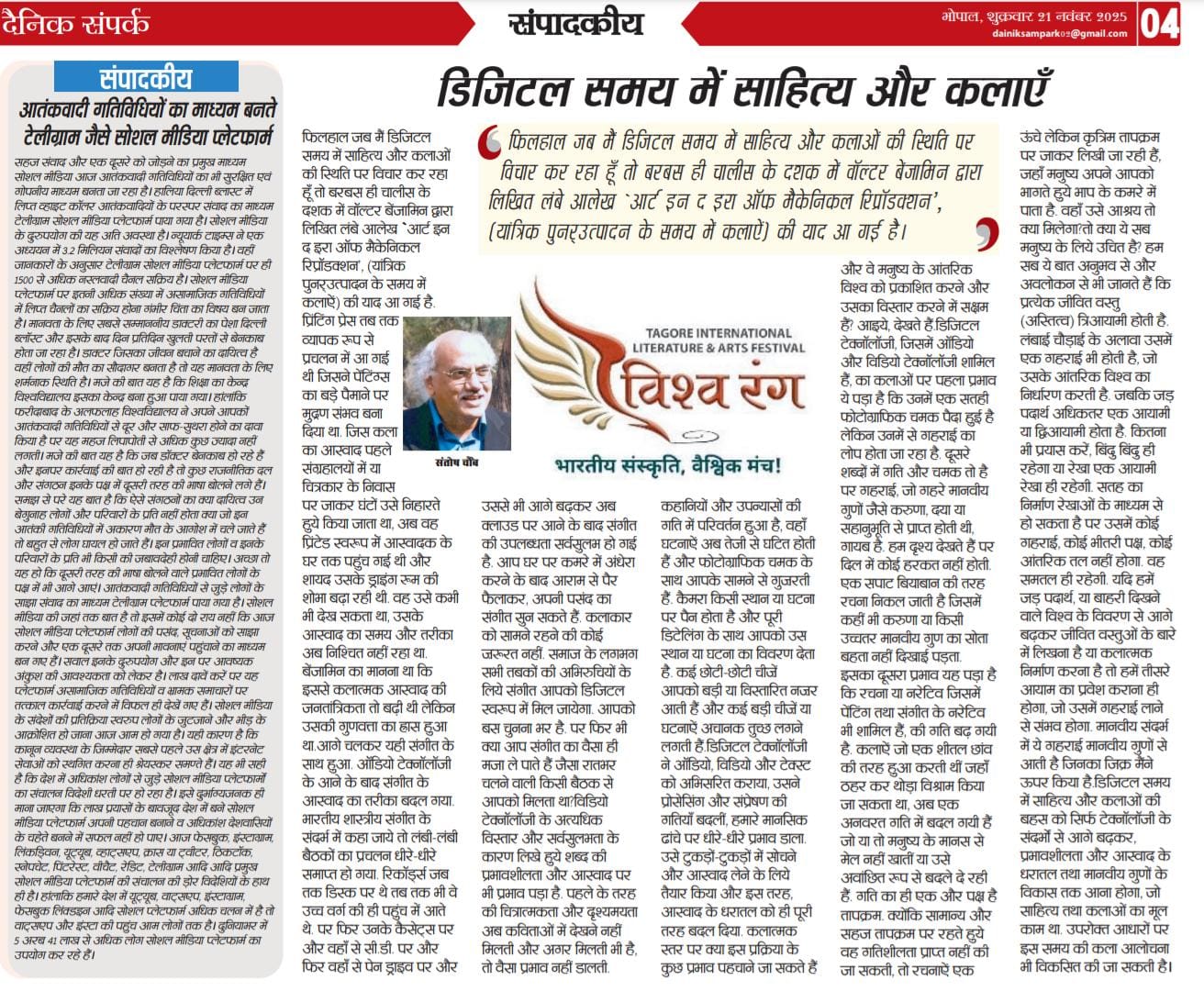 कार्यक्रम में प्रमुख न्यूज़ चैनलों ने हिस्सा लिया और विश्वरंग के आगामी सेशंस व गतिविधियों पर विशेष चर्चा हुई। इस अवसर पर श्री संतोष चौबे (विश्वरंग निदेशक), डॉ. जवाहर कर्णावत, डॉ. पूजा शुक्ला, डॉ. सिद्धार्थ चतुर्वेदी, डॉ. अदिति चतुर्वेदी और श्री विनय उपाध्याय उपस्थित रहे।