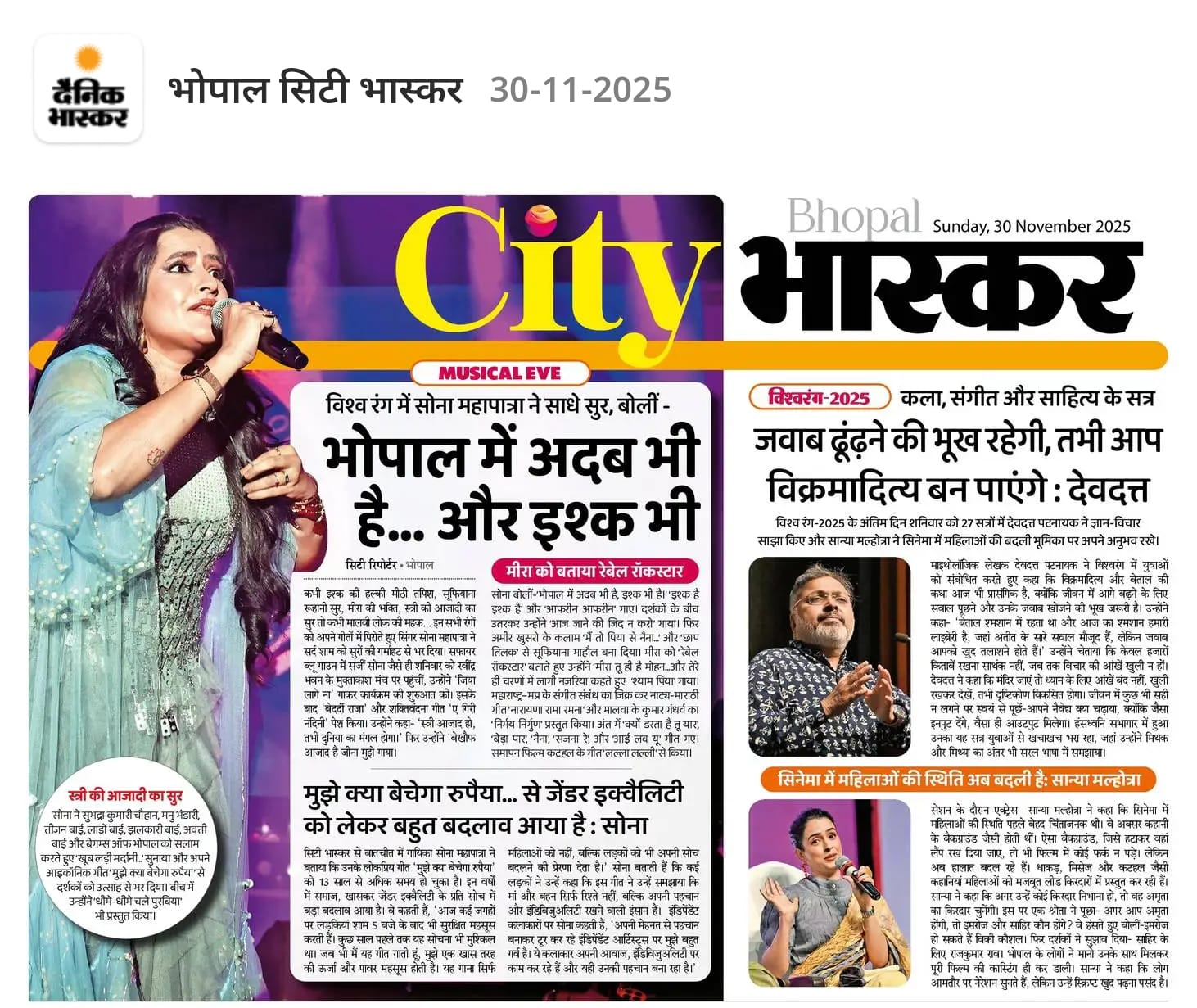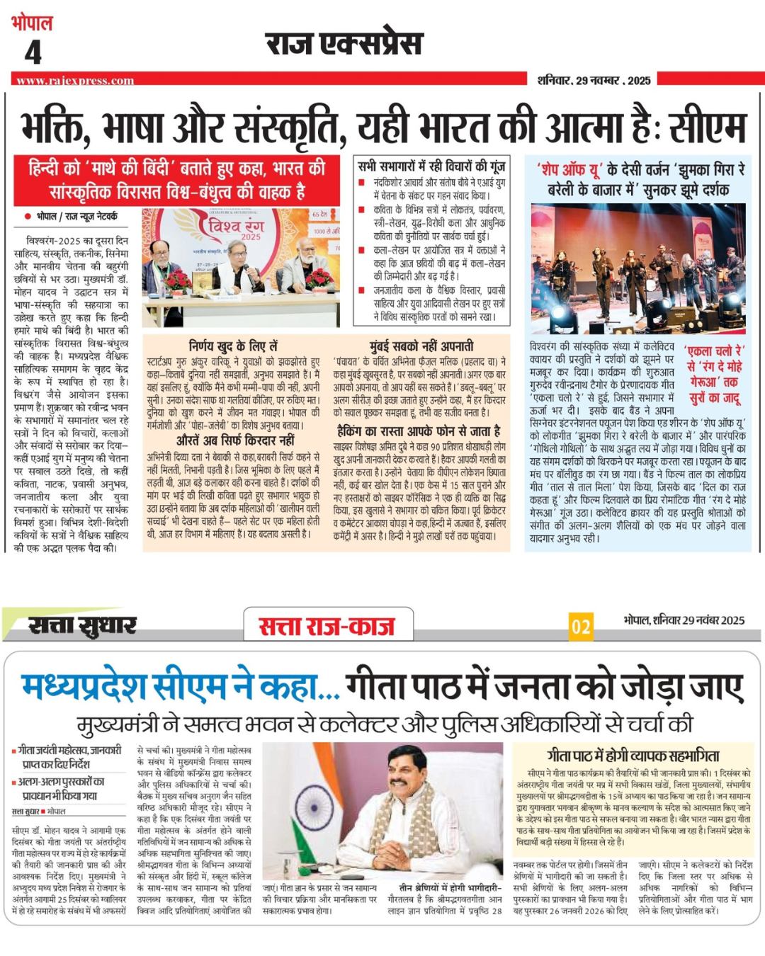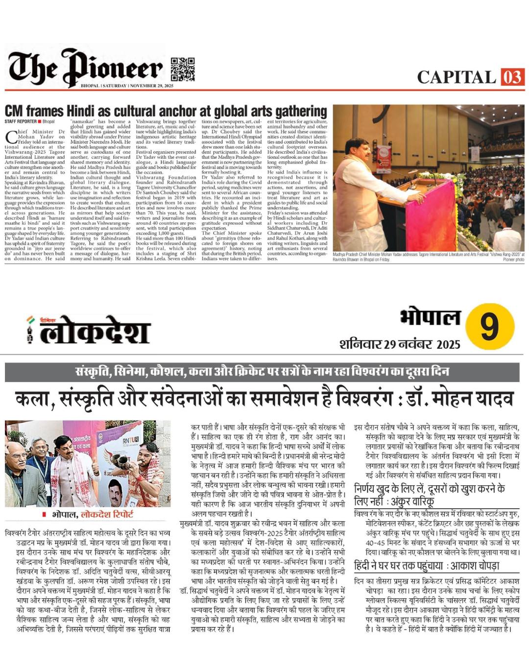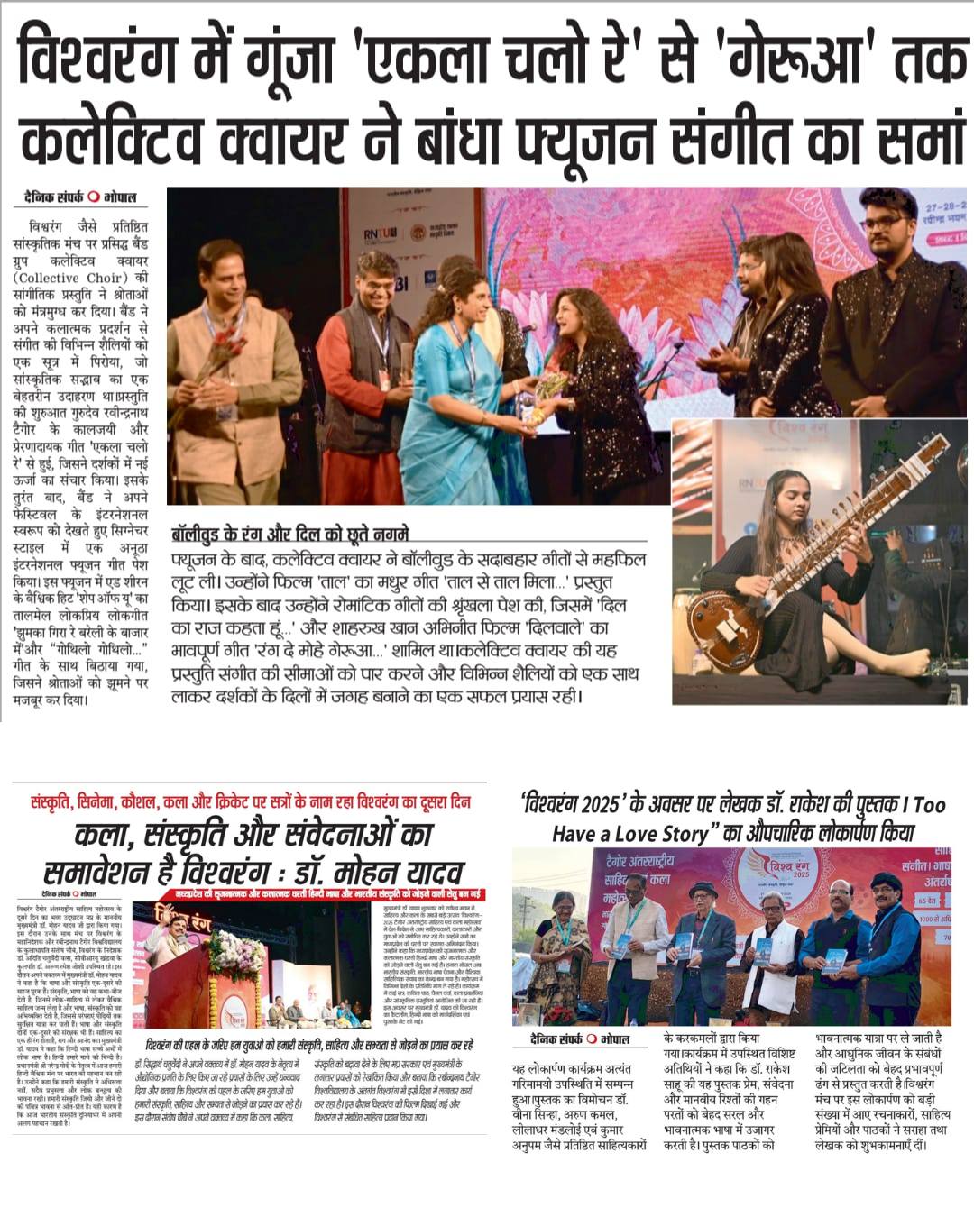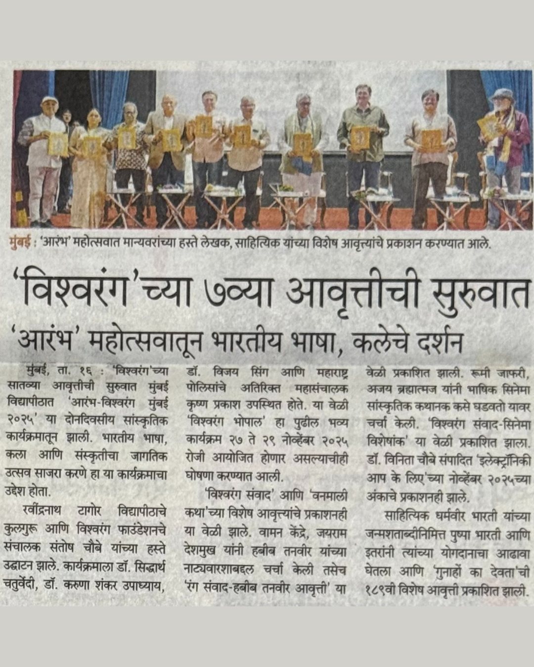 कार्यक्रम में प्रमुख न्यूज़ चैनलों ने हिस्सा लिया और विश्वरंग के आगामी सेशंस व गतिविधियों पर विशेष चर्चा हुई। इस अवसर पर श्री संतोष चौबे (विश्वरंग निदेशक), डॉ. जवाहर कर्णावत, डॉ. पूजा शुक्ला, डॉ. सिद्धार्थ चतुर्वेदी, डॉ. अदिति चतुर्वेदी और श्री विनय उपाध्याय उपस्थित रहे।