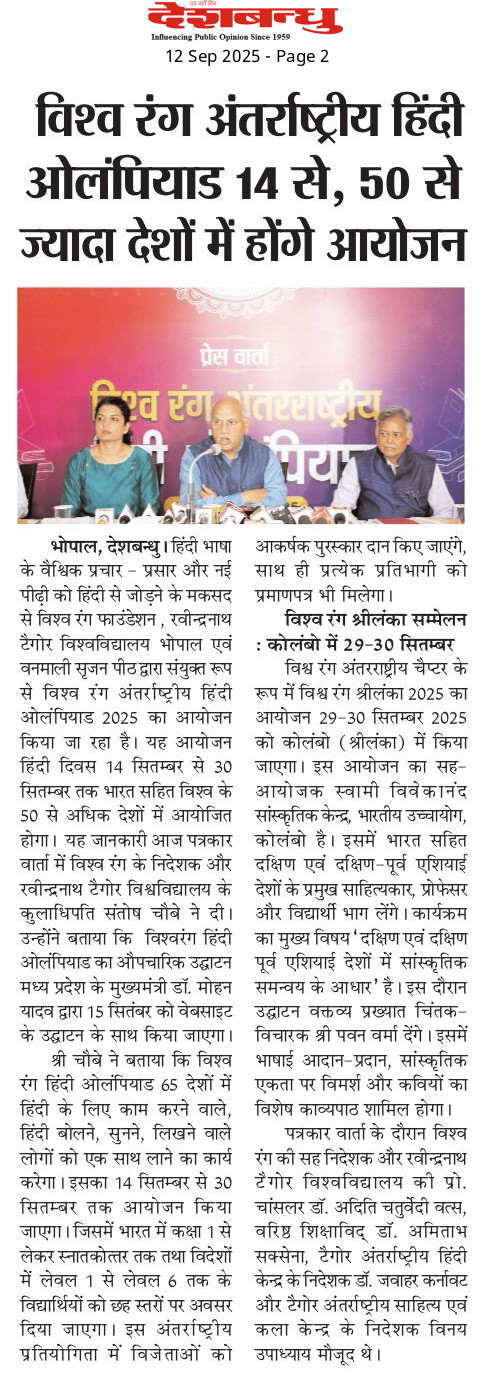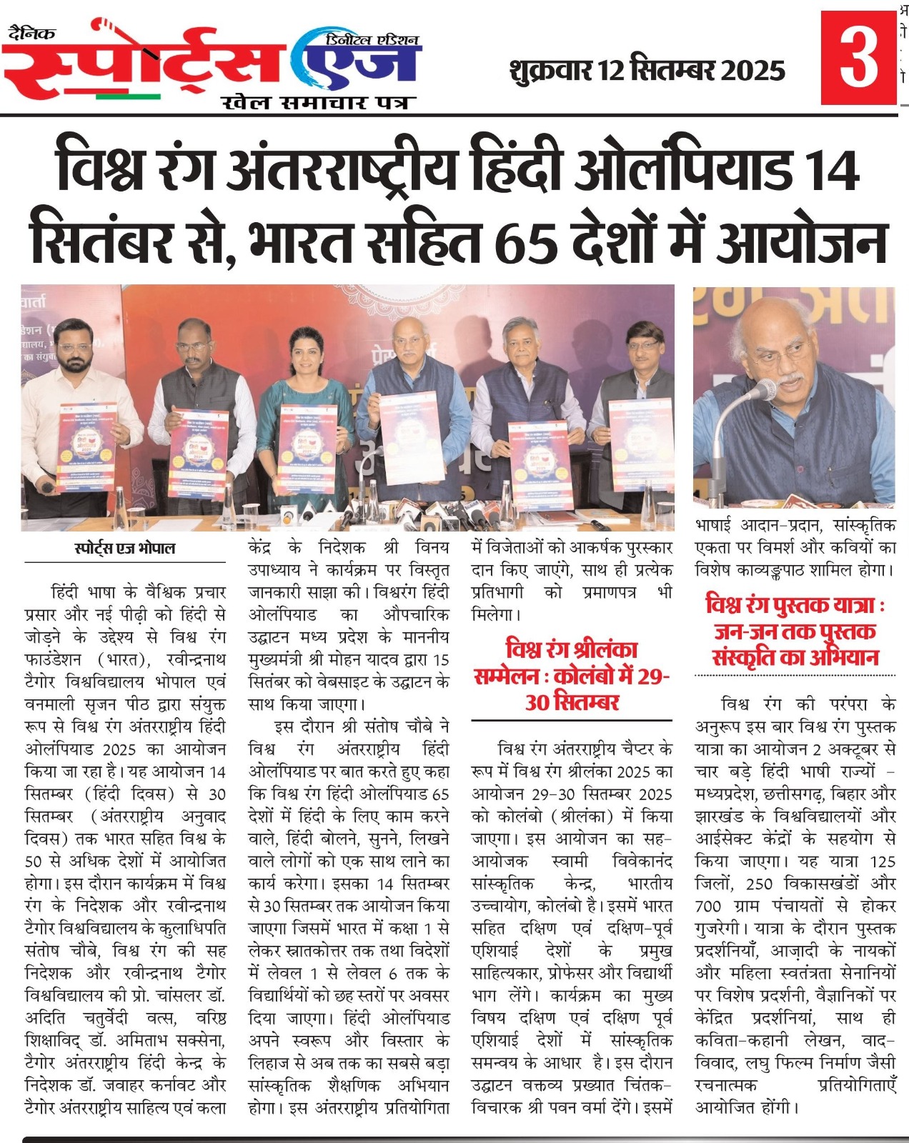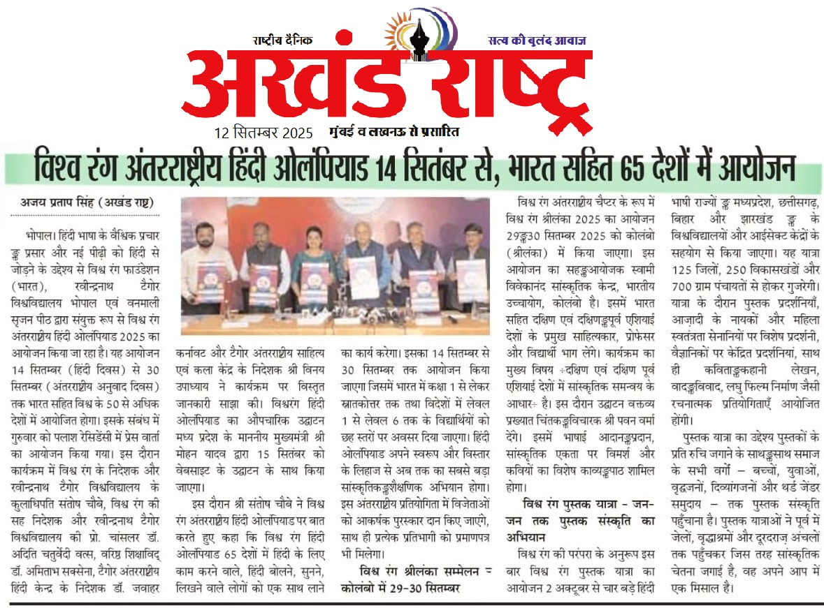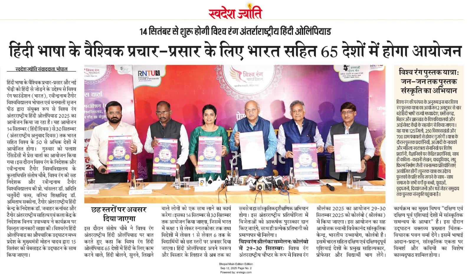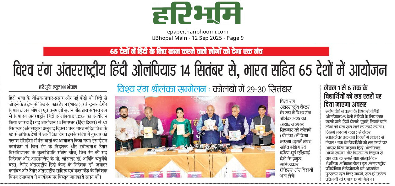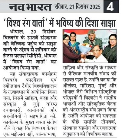 इंदिरा गांधी राष्ट्रीय कला केंद्र, नई दिल्ली में अंतरराष्ट्रीय सहयोग परिषद, वैश्विक हिंदी परिवार एवं दिल्ली विश्वविद्यालय के भारतीय भाषा केंद्र द्वारा आयोजित तीन दिवसीय तृतीय अंतरराष्ट्रीय भारतीय भाषा सम्मेलन में विश्व रंग और रबीन्द्रनाथ टैगोर विश्वविद्यालय की महत्वपूर्ण व रचनात्मक भूमिका रही। समापन अवसर पर मुख्य अतिथि माननीय लोकसभा अध्यक्ष श्री ओम बिड़ला जी को विश्व रंग के अंतर्गत प्रकाशित महत्वपूर्ण पुस्तक ‘विश्व में हिन्दी’ (70 देशों में हिन्दी की स्थिति का परिदृश्य) विश्व रंग के निदेशक एवं रबीन्द्रनाथ टैगोर विश्वविद्यालय के कुलाधिपति श्री संतोष चौबे तथा अंतरराष्ट्रीय हिंदी केंद्र के निदेशक डॉ. जवाहर कर्नावट द्वारा भेंट की गई। सम्मान समारोह की अध्यक्षता करते हुए श्री संतोष चौबे ने देश–विदेश से आए सभी प्रतिभागियों को प्रतीक चिन्ह भेंट कर सम्मानित किया। साथ ही विश्व रंग अंतरराष्ट्रीय हिन्दी ओलंपियाड के अंतर्गत कजाकिस्तान के विजेताओं की ट्रॉफी, सम्मान पत्र एवं सम्मान राशि प्रो. उल्फत मुखीबोवा (ताशकंद विश्वविद्यालय, उज़्बेकिस्तान) को प्रदान की गई। इस अवसर पर आपने विश्व रंग अंतरराष्ट्रीय हिन्दी ओलंपियाड और विश्व रंग की वैश्विक दृष्टि पर अपने विचार साझा किए। कार्यक्रम में विश्व रंग के सचिव संजय सिंह राठौर भी उपस्थित रहे।