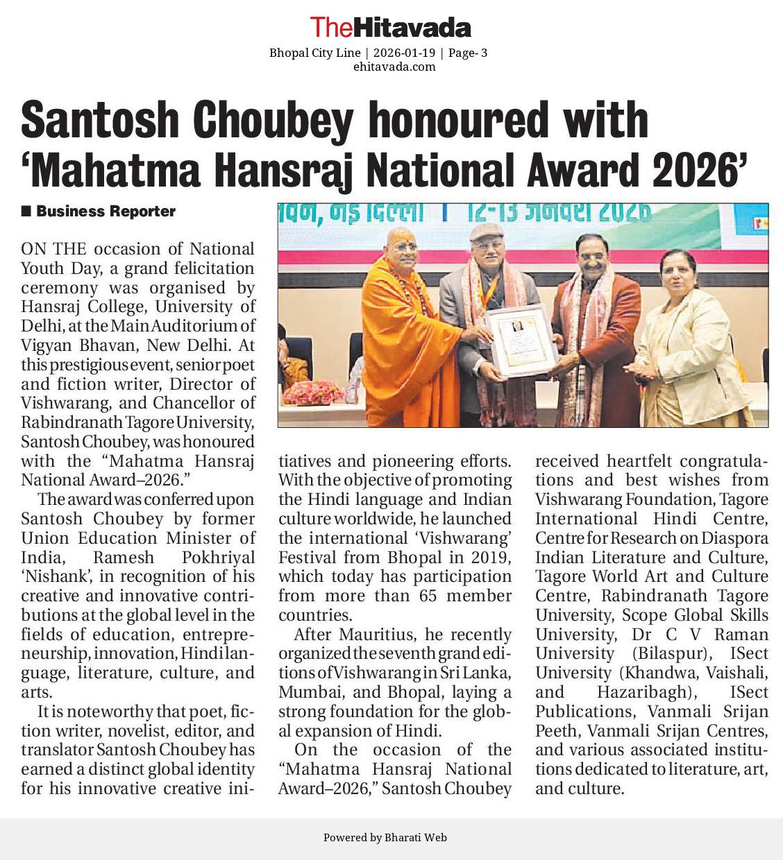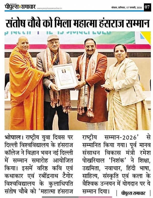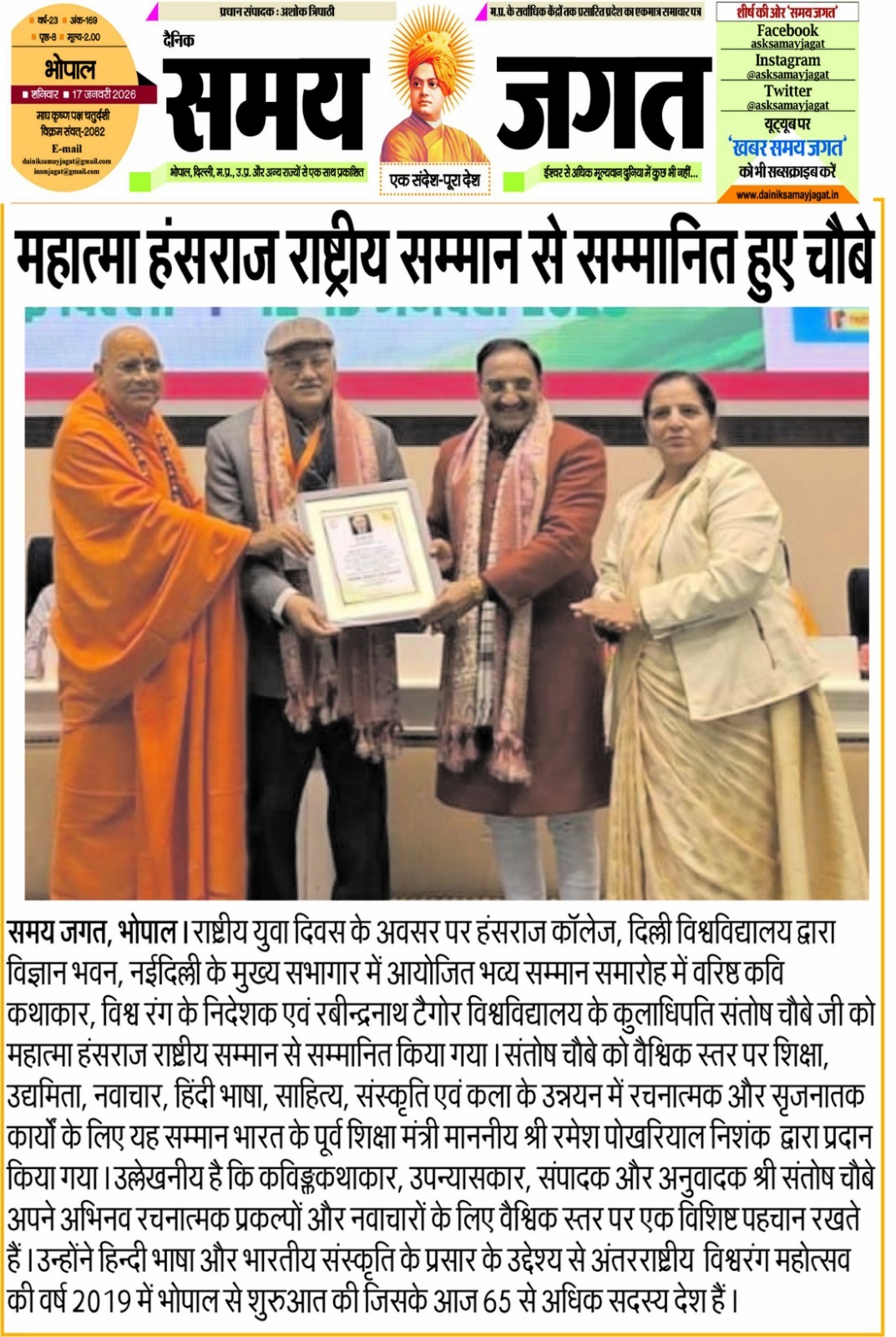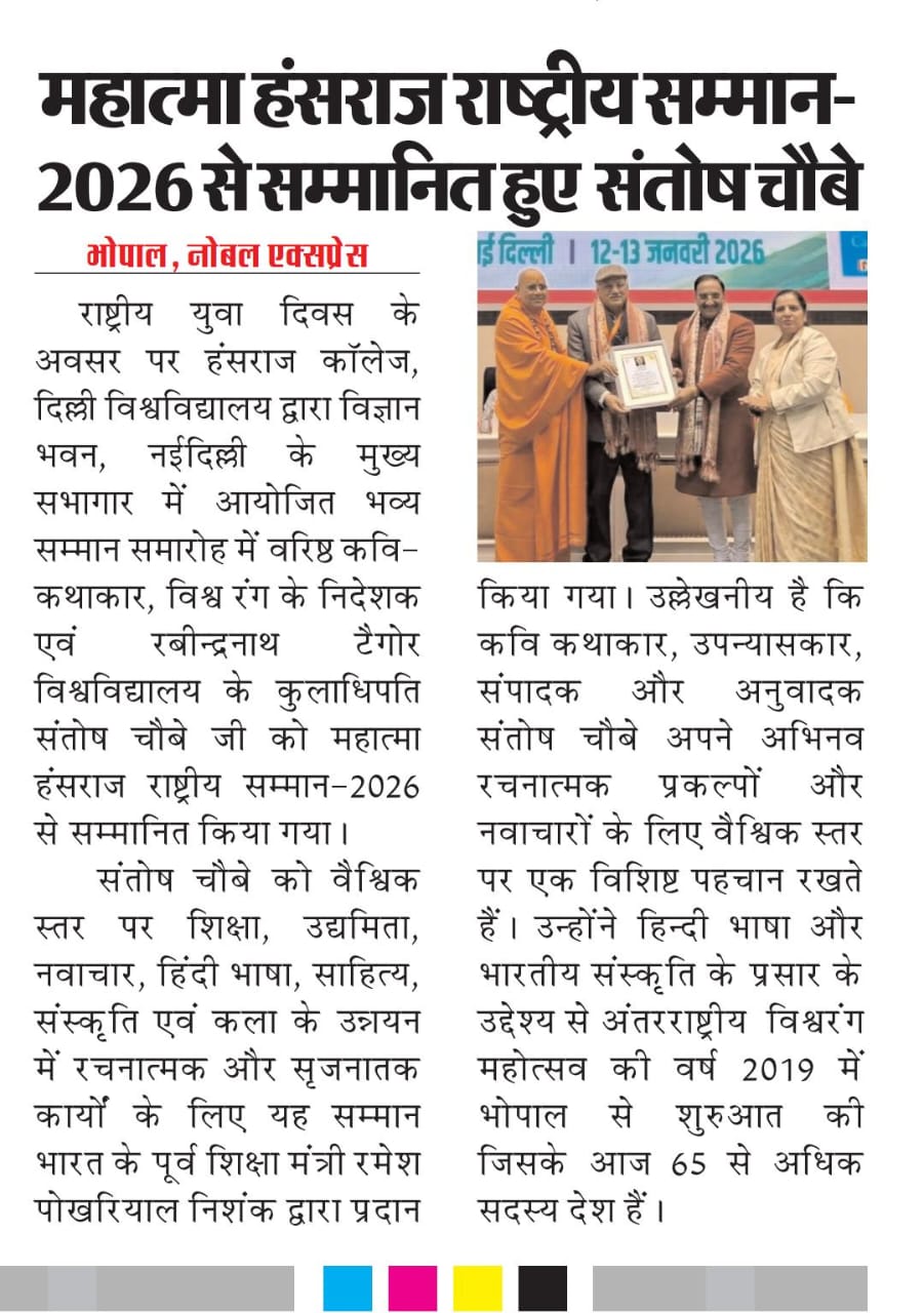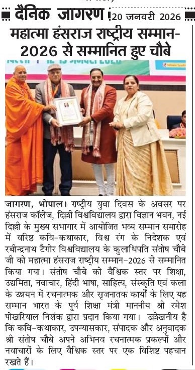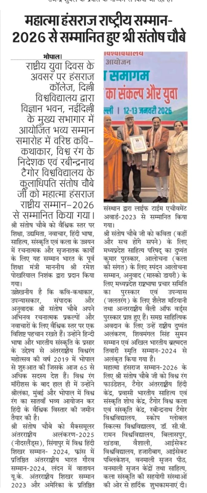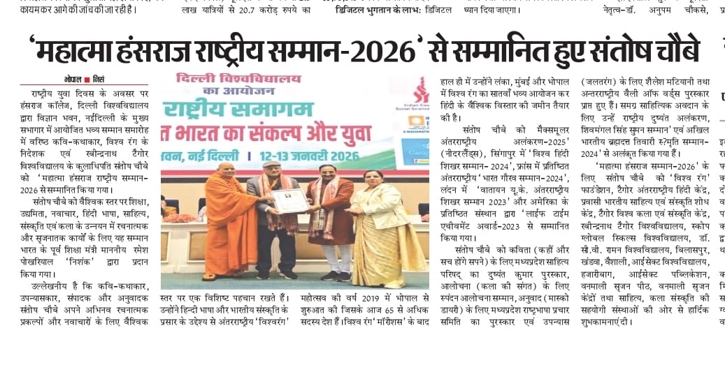 राष्ट्रीय युवा दिवस के अवसर पर हंसराज कॉलेज, दिल्ली विश्वविद्यालय द्वारा विज्ञान भवन, नईदिल्ली के मुख्य सभागार में आयोजित भव्य सम्मान समारोह में वरिष्ठ कवि–कथाकार, विश्व रंग के निदेशक एवं रबीन्द्रनाथ टैगोर विश्वविद्यालय के कुलाधिपति संतोष चौबे जी को "महात्मा हंसराज राष्ट्रीय सम्मान–2026 से सम्मानित किया गया।
